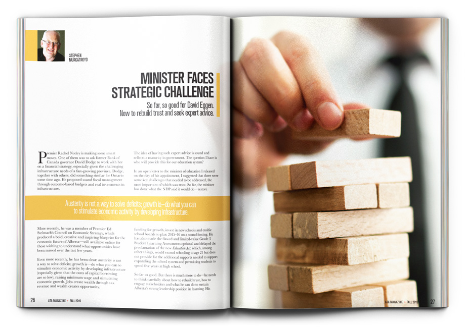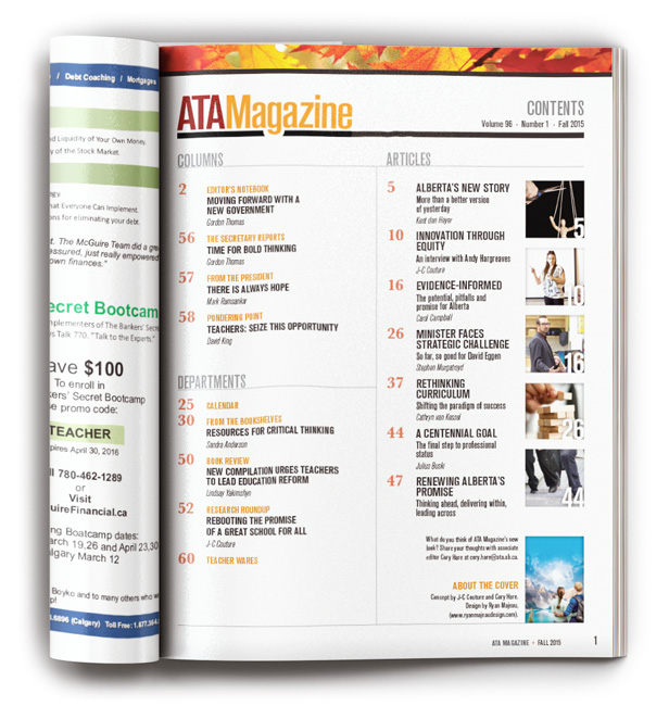 Design and layout of the ATA Magazine, a quarterly publication for the Alberta Teachers’ Association (56 pages).